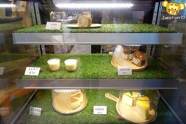 除了菜單上的餐點,甜點就要來櫃檯這看看,鋪上綠色的小草像野餐一樣很可愛,不過剩下的甜點不多,也沒特別吸引我們索性放棄~