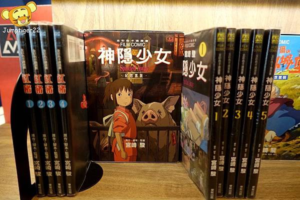 而另外一邊則是書櫃,這陣子我剛好一直在netflix上看宮崎駿的作品,而書櫃裡就有神隱少女、霍爾的移動城堡等經典著作!