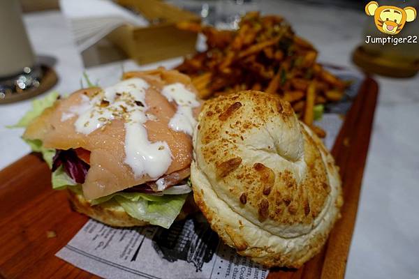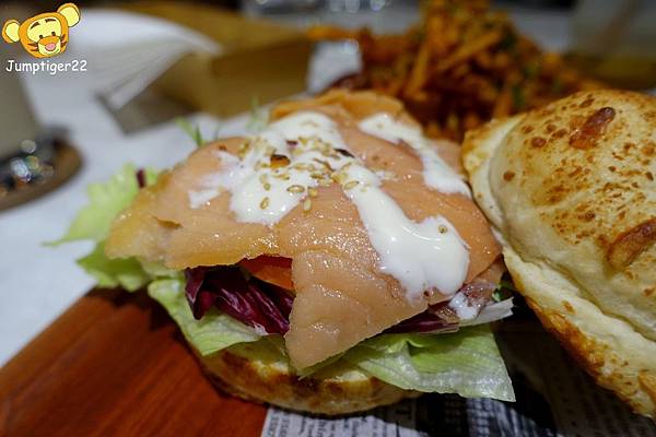 層層蔬食上頭鋪上挪威的鮭魚(可以鋪上挪威的森林嗎哈哈哈)