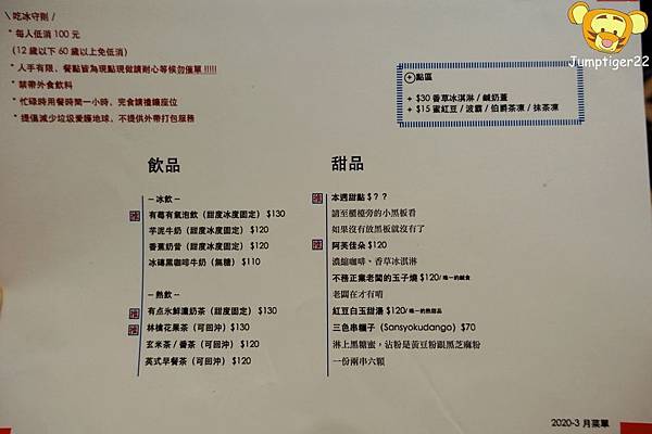 店裡的菜單就是飲品、甜品與冰品三種,低消100/人,所以點一項基本上就是達標囉~