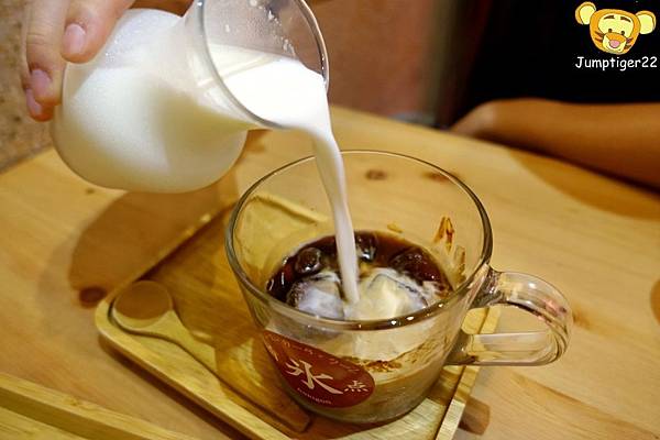 慢慢積牛奶加入咖啡冰磚之中,成了拿鐵咖啡!