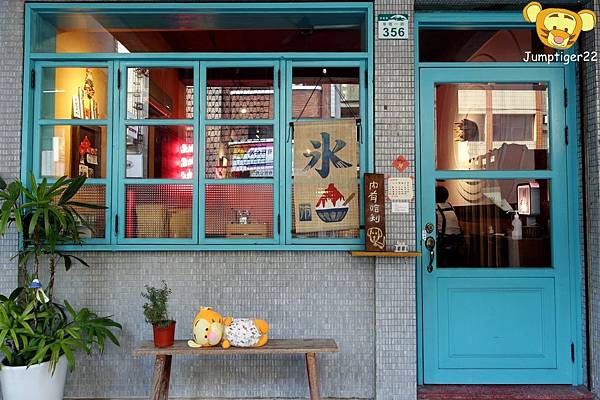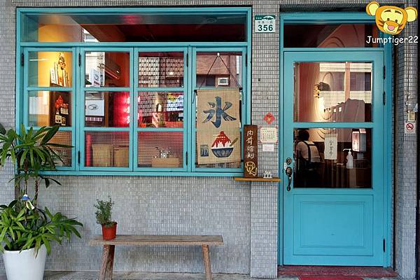 這種藍綠色的邊框本身就帶有點復刻感,門前的長板凳更是網美取景的好所在
