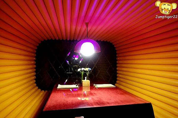 像是一個時空膠囊的包廂,配色與燈光讓人有點迷幻的感覺,這是一個很適合戀愛的座位XD