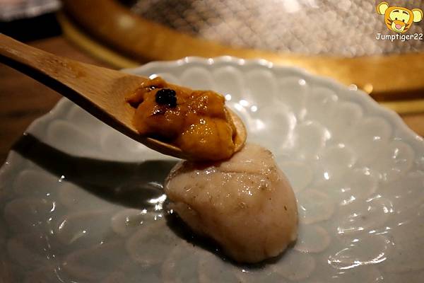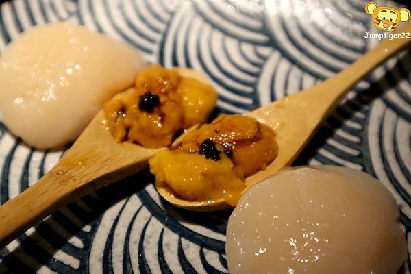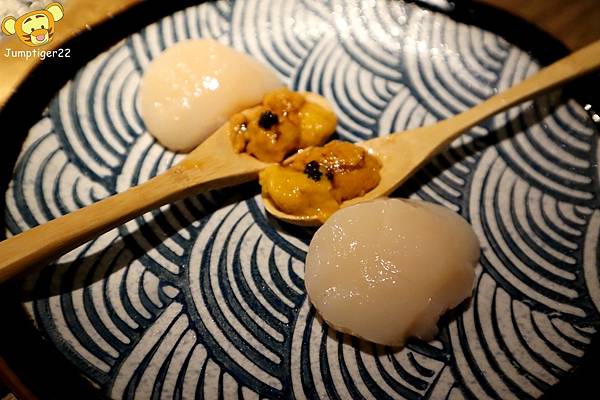 干貝是生食級的北海道大干貝,搭上旁邊一匙的海膽與上頭的烏魚子,這種海鮮饗宴讓人還沒入口就流口水了啊