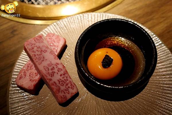 而一旁的月見醬就是蛋黃與甘甜醬油,攪拌後就可以給和牛沾著吃唷~