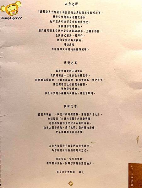 路易奇火力會社的菜單第一頁有解釋火力之源起,特別強調店裡使用的和牛是從日本空運的頂級A5和牛唷!