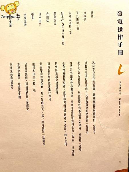 菜單的最後還有火力發電的操作手冊,總不能點了挑戰還真的都烤燒焦吧!
