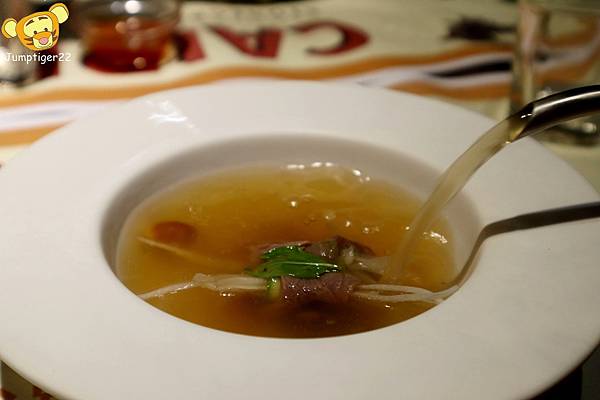在凱恩斯中湯品是真的最後才上唷,餐單是二選一(歐式牛肝菌菇濃湯/老火牛骨湯沖牛肉)