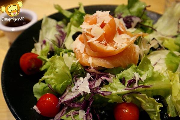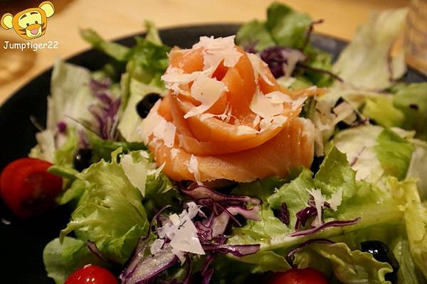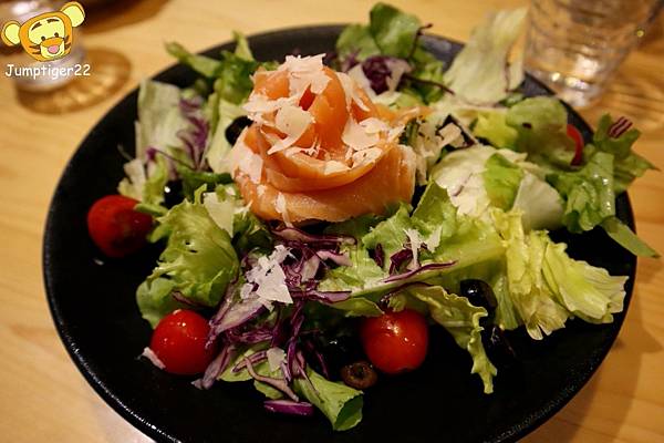 不過友人在瘦身說只要吃沙拉當主食,就點了有煙燻鮭魚的沙拉,份量當然更大拉~