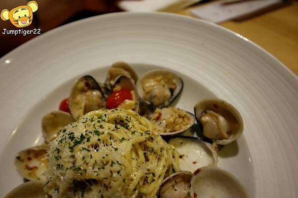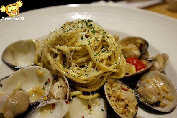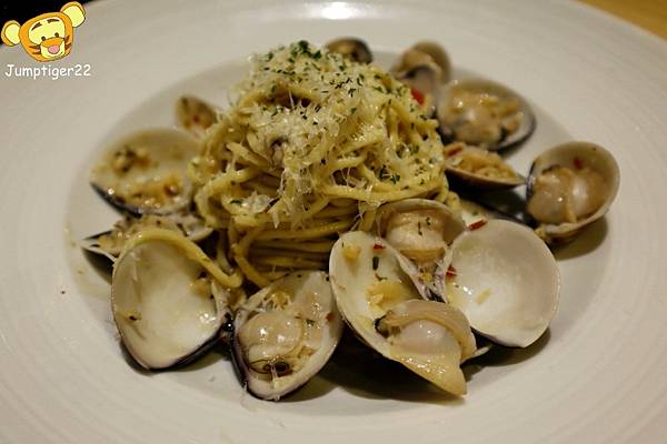 帶點白酒的香氣,新鮮的蛤蜊乖巧的繞著麵塔圍成一圈
