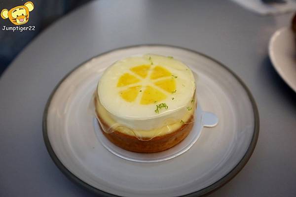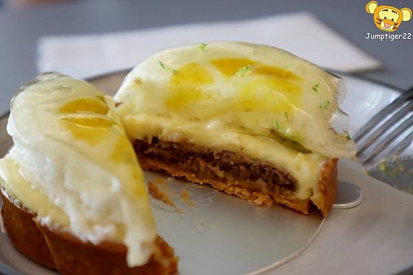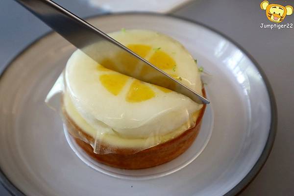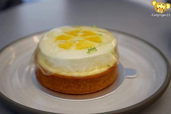 底部是酥脆的塔皮,上層抹上金桔奶油醬再蓋上糖漬檸橙金桔果凍,讓整個甜點帶著酸感大於甜蜜感