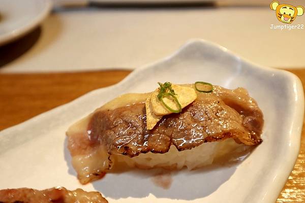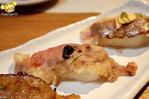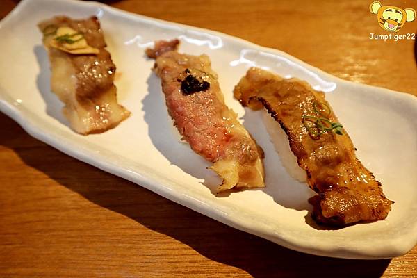笈炙牛是三種不同調味的組合,由左至右分別為鹽味牛腹肉握壽司/松露牛肉握壽司/醬燒牛腹肉握壽司
