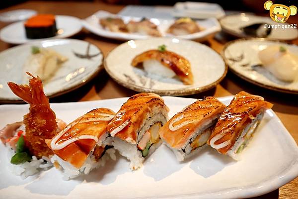 壽司出餐的時間算是蠻快的,一下子就擺滿桌,而且一笈的壽司盤頗美的!