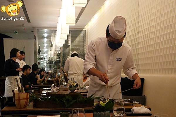 ▼ 享用完第一道前菜後,料理師傅就出動推著香魚來桌邊囉~