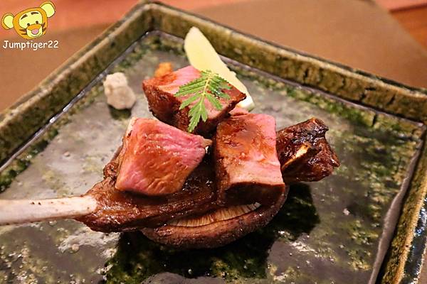 選用紐西蘭小羔羊的羊排與台中新社的大朵香菇,淋上花椒醬油上桌。