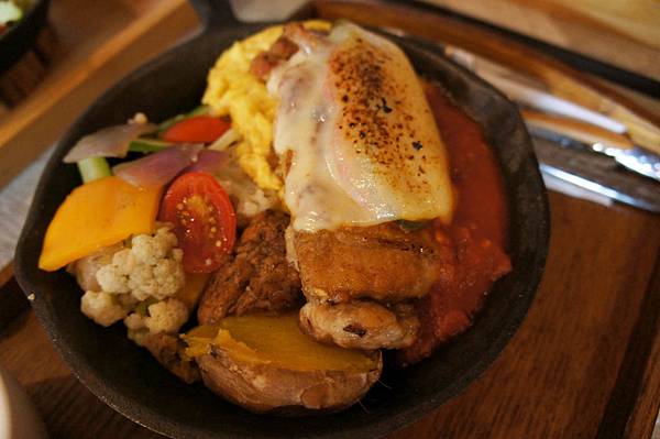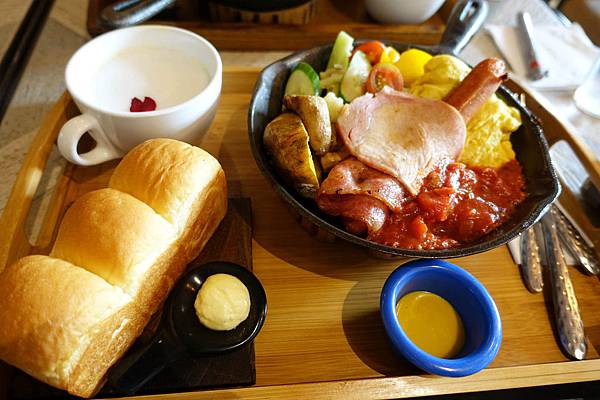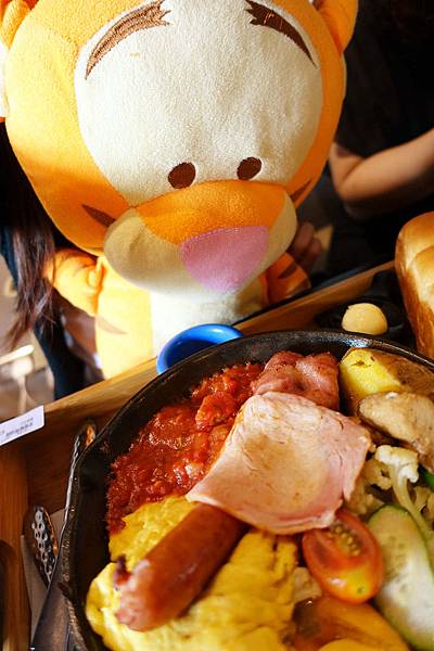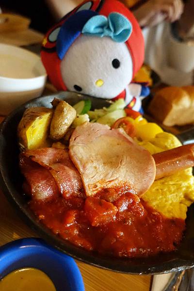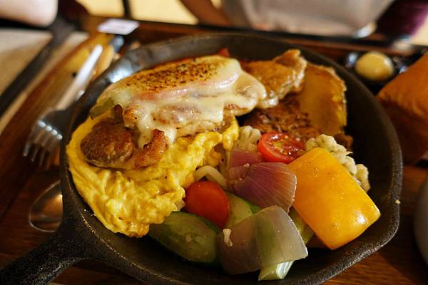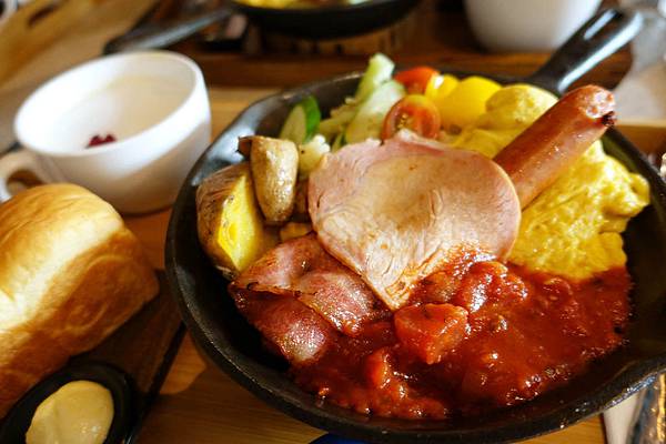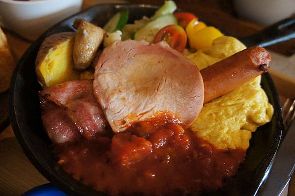 這鐵盤端上桌就好喜歡!火腿、培根、德式香腸,小黃瓜、番茄、地瓜還有炒蛋,配上酸酸甜甜的茄式醬料~