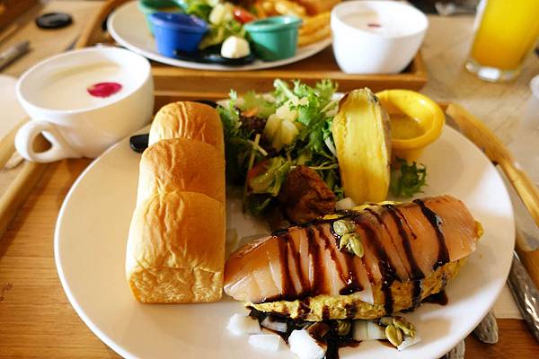 網路上很推薦這道餐點,所以虎賊賊就說要點這道,鮭魚很新鮮、味道也很特別,旁邊的菜則是生菜和地瓜,而且鮭魚分量也很大一片耶~