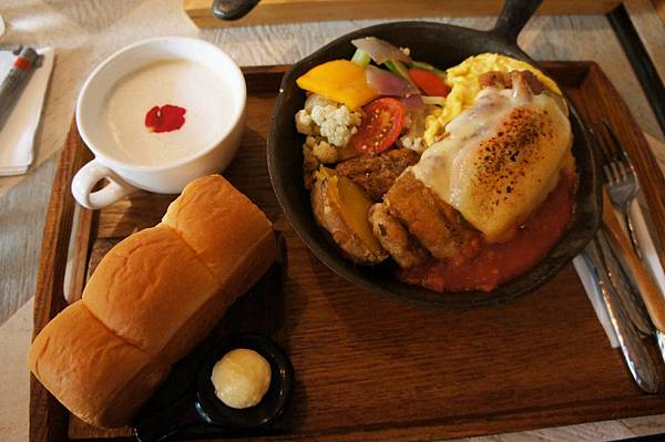 餐點都會附上濃湯,看起來上面浮一層白白泡泡一開始我誤以為是附牛奶,友人喝了以後才說是玉米濃湯,果真整杯濃湯奶香四溢,喝了以後還想再喝多一點阿!難怪這加店會叫做多一點阿!!!